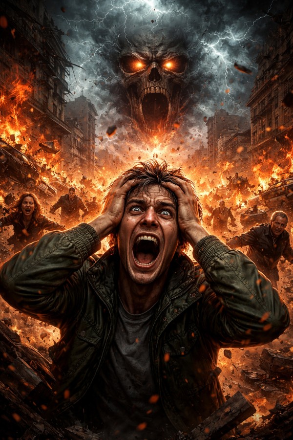 „Angst und Chaos“ als Bildauftrag an ChatGPT (das sich bei der Bilderstellung offensichtlich aus Klischees von Horrorfilmen bedient hat) |