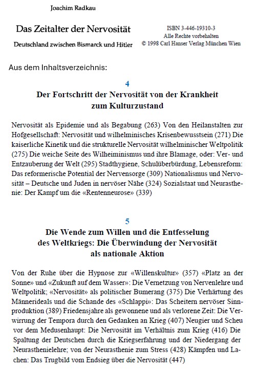 Voraussichtliche Themen dieses Teilblogs: Da man nicht wissen kann, welche Bocksprünge der Zeitgeist in Zukunft vollführt, hier zunächst nur stichwortartig ein paar Überlegungen zu den Sprüngen in der Vergangenheit. Sobald ausgearbeitet, erscheint der entsprechende Titel unterstrichen und blau unterlegt. Weitere Themen werden dann aktuell dazu kommen. Aufgeregte Zeitgenossen während der Französischen Revolution (Reddy) Aufgeregte Zeitgenossen von Bismark zu Hitler (Radkau) Erschöpfte Zeitgenossen: Depressionen statt Neurosen (Ehrenberg) Der Untergang der Titanic und die Spanische Grippe: zwei Erinnerungsgeschichten Börsen: Manias und Panics (Kindleberger) Das Ende der Westlichen Hybris als eine Abfolge von Krisen: Vom 11. September 2001 bis zur aktuellen Gegenwart Verschwörungsleugnung und Verschwörungsglauben am Beispiel der Ermordung von J.F. Kennedy und der Coronaepidemie: Unterdeter-minierte Verlautbarungen und überdeterminiertes Raunen Risikogesellschaft 2.0: Angst als Treibstoff spätkapitalistischer Gesellschaften Paradoxes im Endkampf ums Öl …..